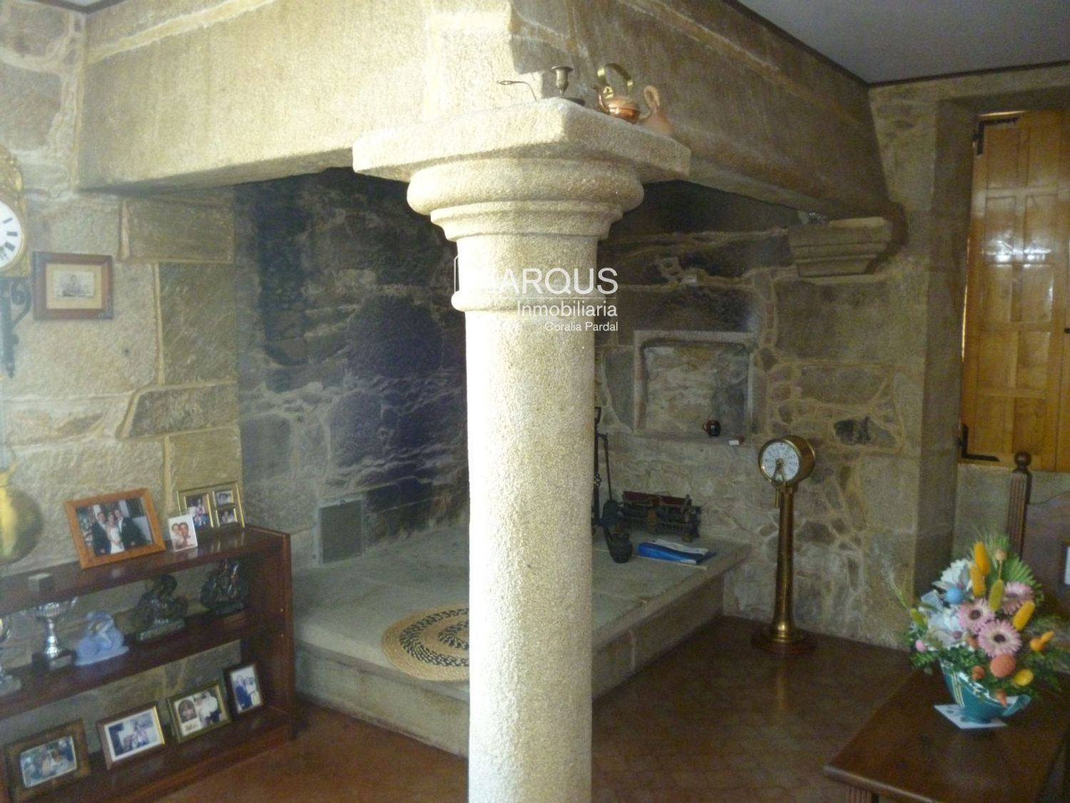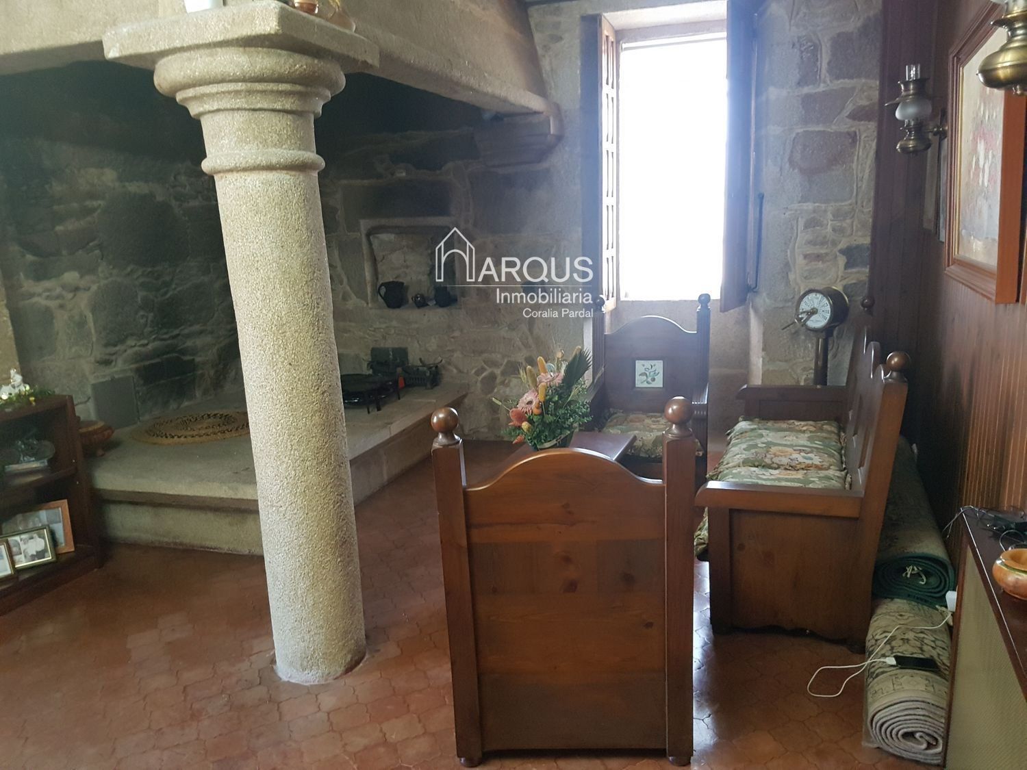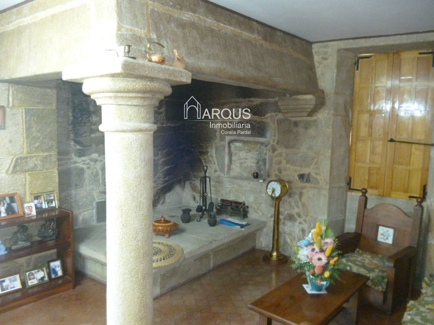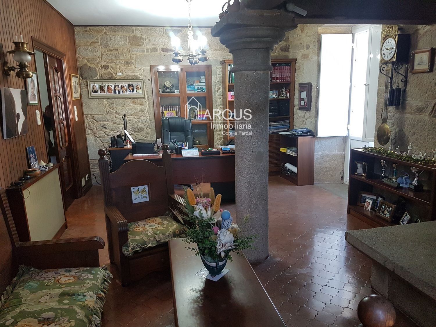 Primera planta cuenta con 3 dormitorios, 2 baños y sala de estar-despacho con una lareira espectacular.