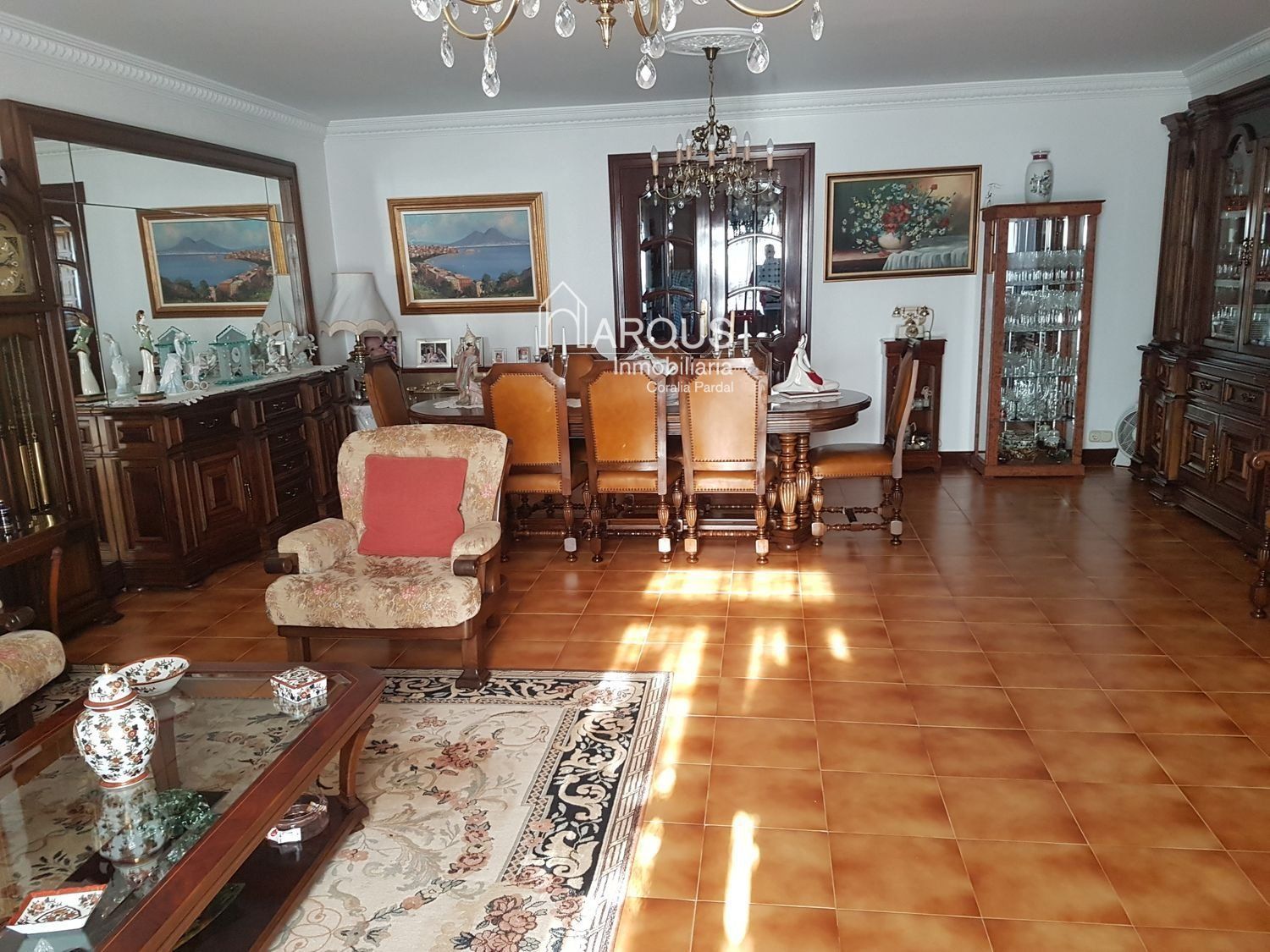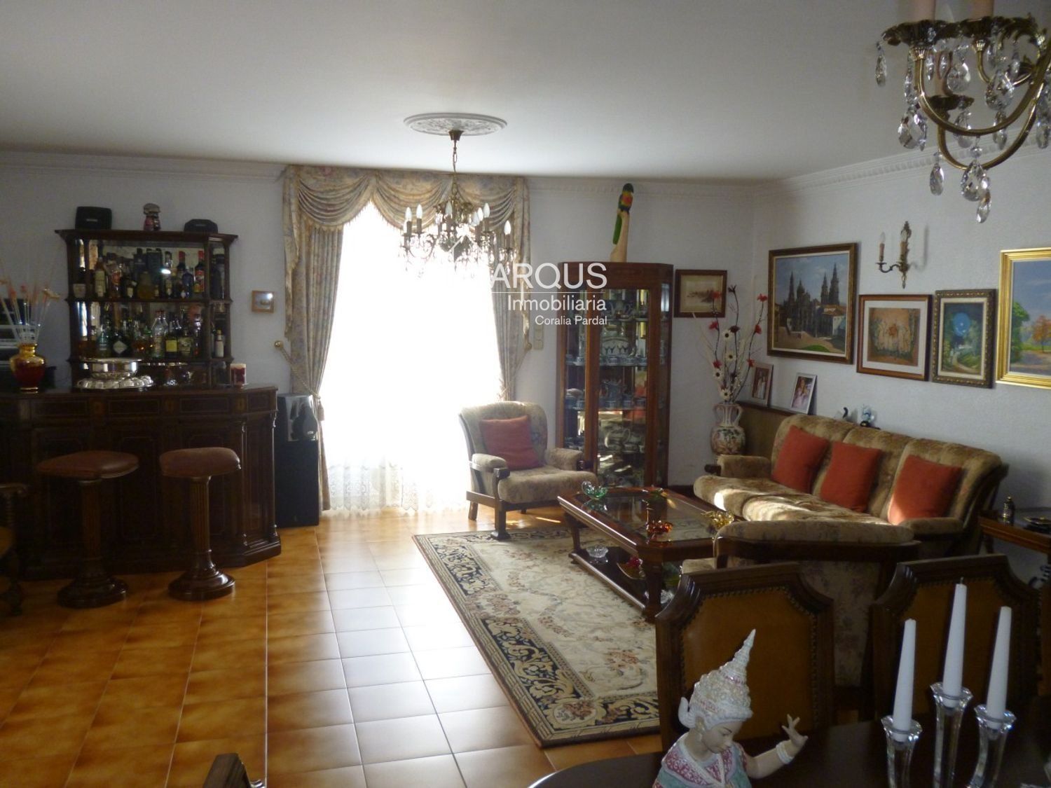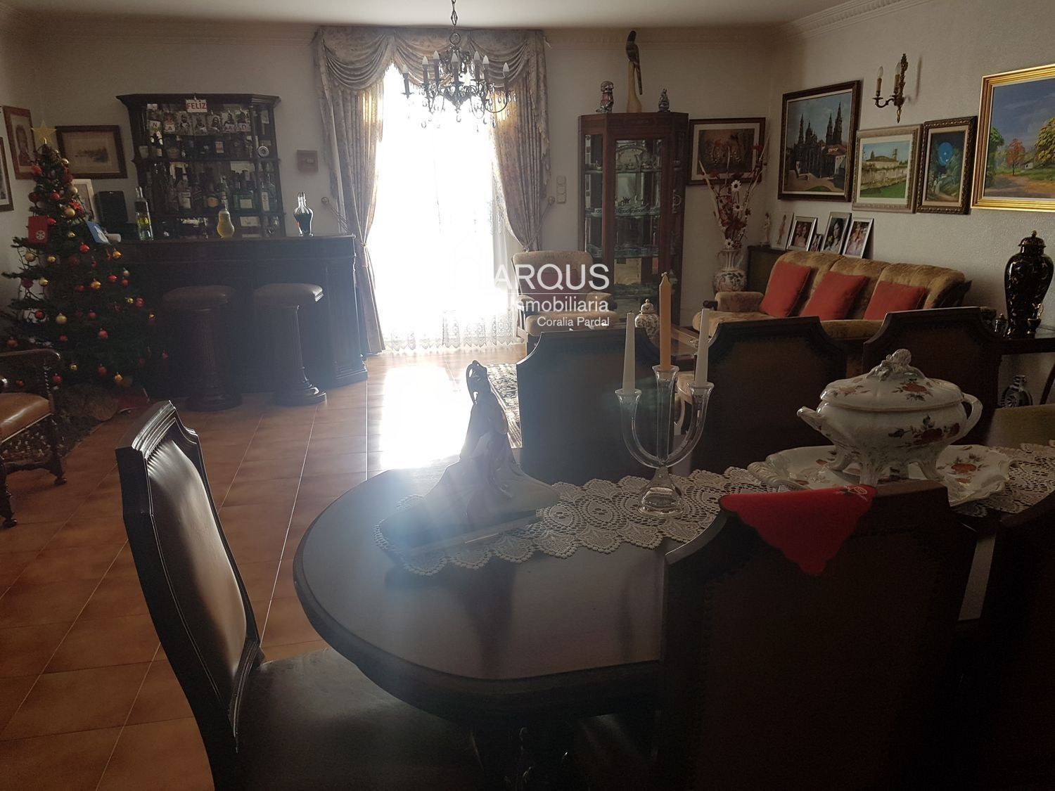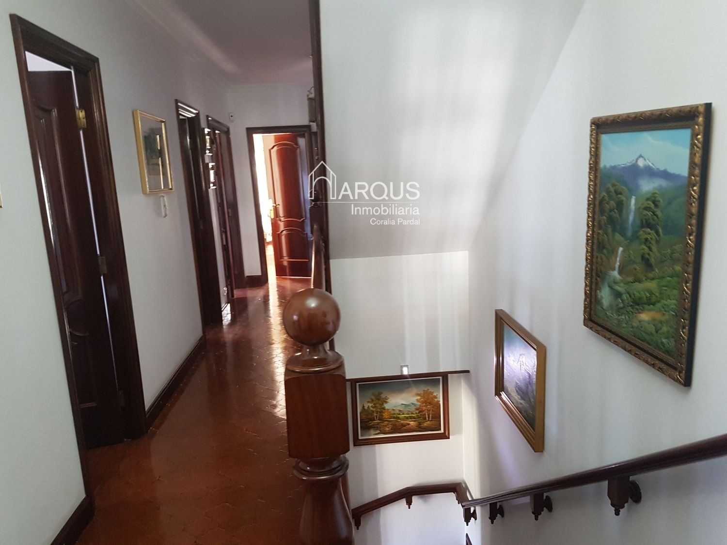 Primera planta cuenta con 3 dormitorios, 2 baños y sala de estar-despacho con una lareira espectacular.