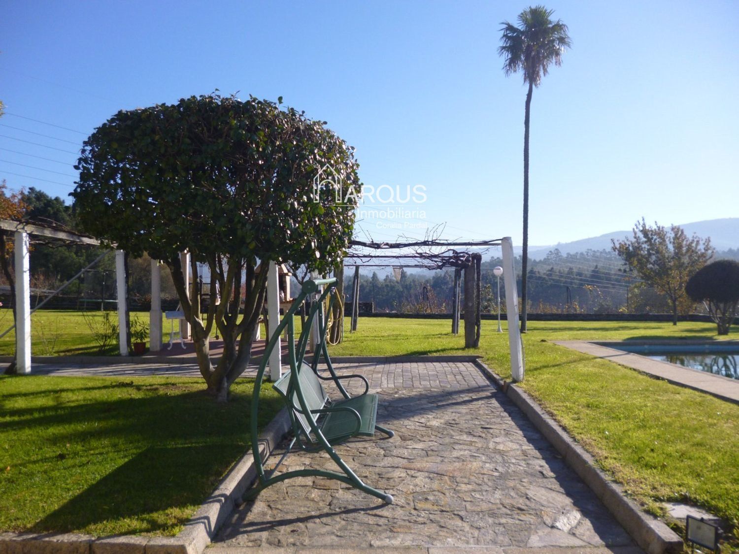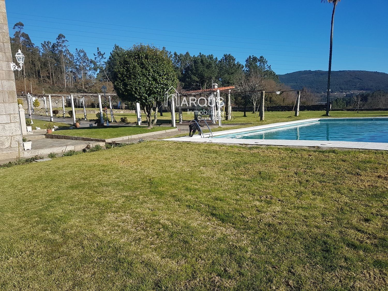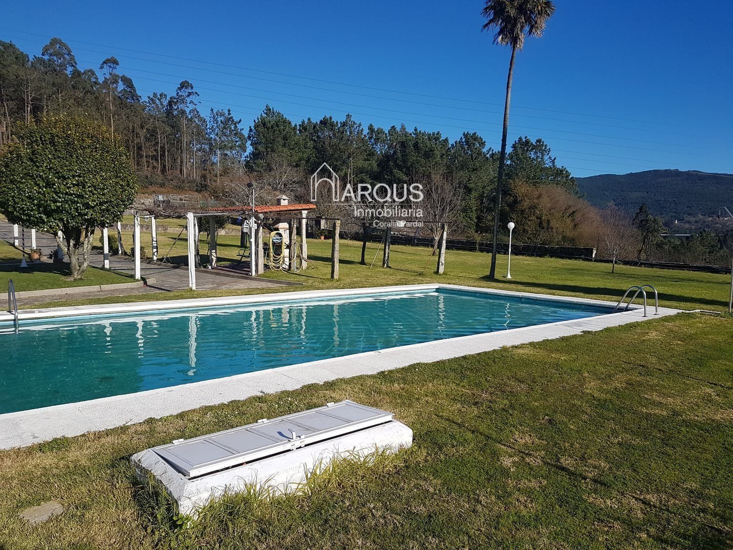En la parte ajardinada nos encontramos también la gran piscina y la zona de barbacoa.